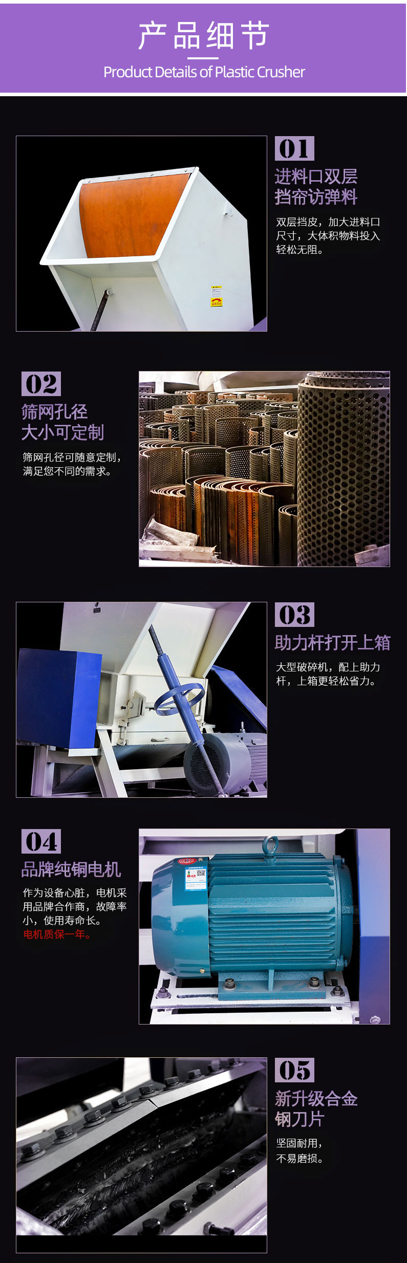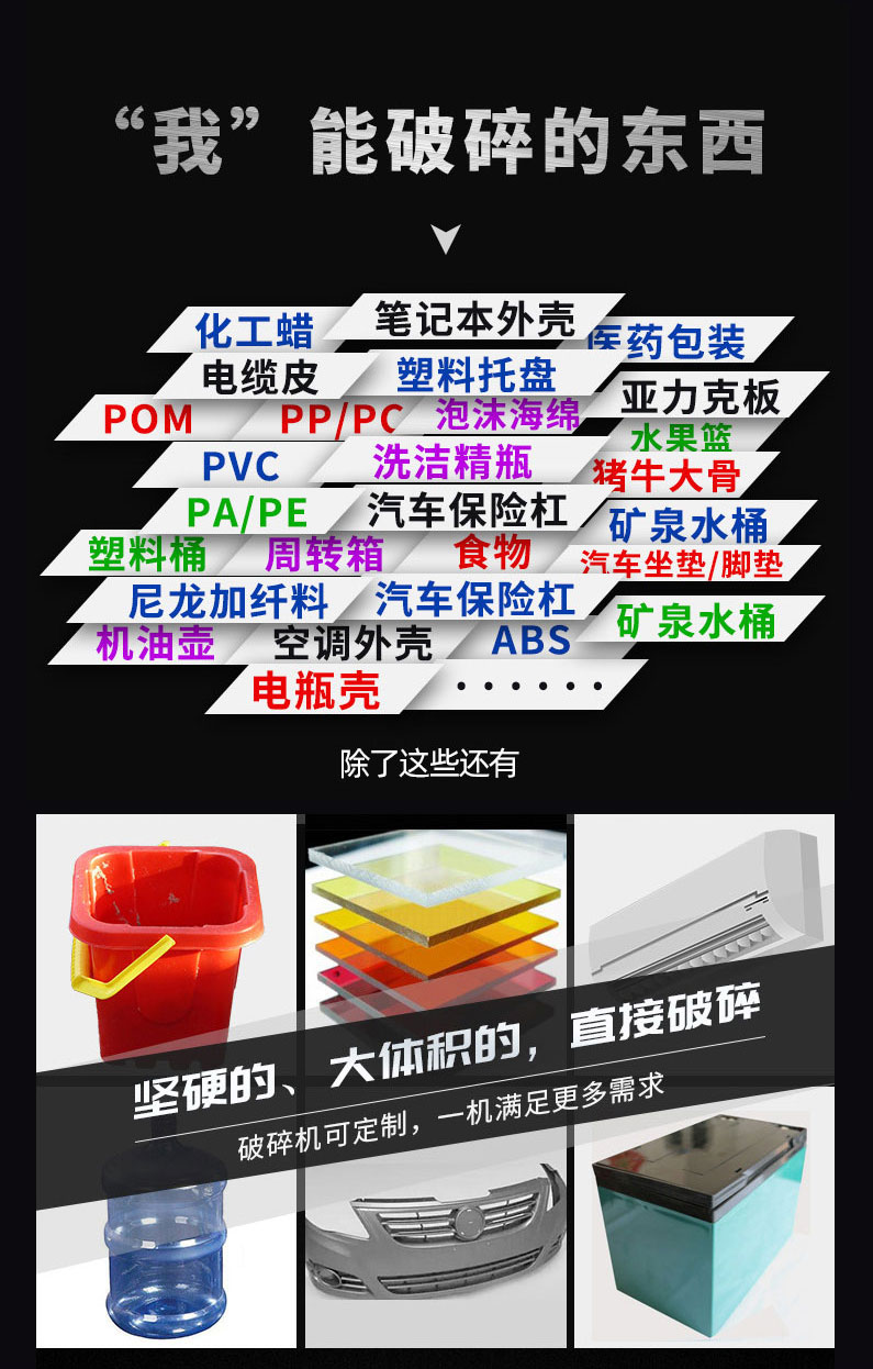 塑料破碎機,大型塑料破碎機的特點強力破碎機刀具采用名廠優(yōu)質(zhì)精鋼精工而制,特別堅固耐用,粉碎各類軟、硬塑膠,輕松容易。前后隔音防音設(shè)計,噪音極小。設(shè)計精簡,占地特少,維護容易。門較式分離設(shè)計,清掃換網(wǎng)特別容易。馬達裝有過荷保護與電源連鎖保護,保護馬達、刀具、工作人員。制造工藝成熟、機體、刀架等主要部件采用整體加工,確保配合精度。粉碎膠頭、薄膜,有特別粉碎機供選擇,以更好的適應。